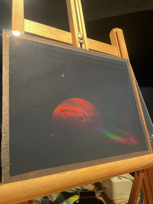 A small bronze sphere hangs from a long chain from the tall ceiling. The bronze incense burner, the Touching Tails Ultrasonic Safe Psychic Space Incense Burner, a dark moon, hovers above the water, rippling its reflection in the carpet. The carpet, Abyssal Puddle, is a gentle invitation to lie down and view the exhibition from this position, surrounded by representations of pleasure. The shimmering holographic tactile print on the carpet water, a sign of arousal for women –cum, juices, gushing. It is large enough for two people to lay on, soft, slippery, float in the abyss. Different perspectives and views exist simultaneously.